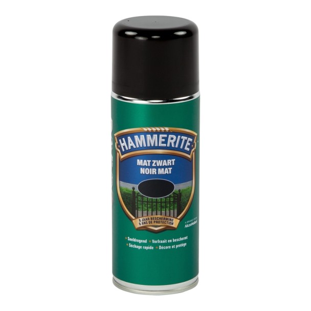 La laque en spray pour métaux noire de la marque Hammerite convient parfaitement pour décorer et protéger tous types de métaux contre la rouille ; elle est garantie 8 ans, s’applique directement sur la rouille sans primaire, stoppe la corrosion, résiste aux intempéries, offre un rendement de 1,25 m² par aérosol et est recouvrable entre 15 minutes et 3 heures.